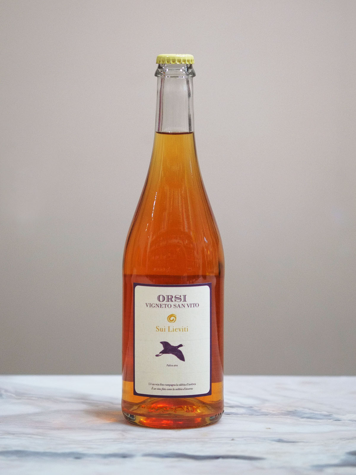 Sui Lieviti 2021 is a natural Sparkling Orange wine from Emilia-Romagna, Italy, crafted by Orsi. Made exclusively from Pignoletto grapes, this wine offers a harmonious blend of fresh fruitiness and subtle oxidative notes. Expect vibrant aromas of green apple and pear with a hint of almond. On the palate, it is lively and textured, featuring bright acidity and a smooth, lingering finish. Perfect for pairing with light appetizers, seafood, and creamy cheeses.