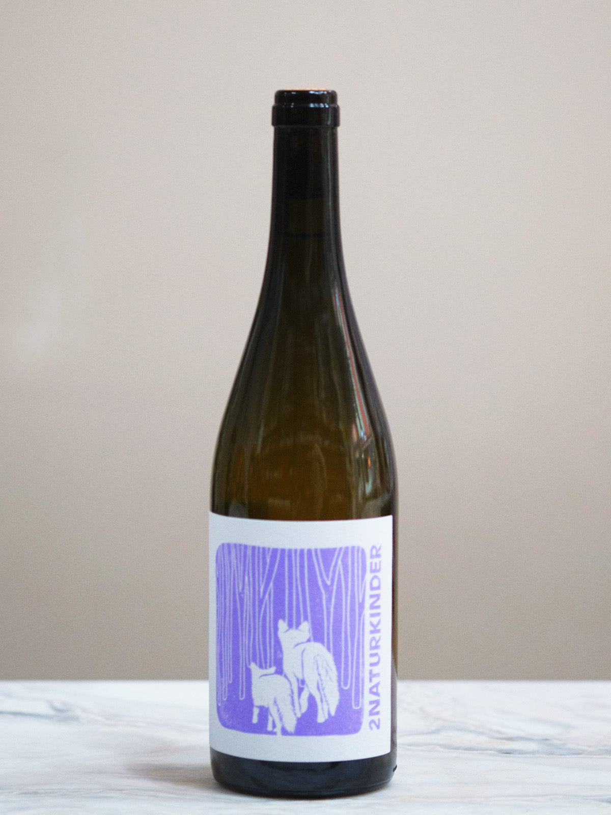 2Naturkinder – Vater & Sohn is a crisp, natural white blend of Bacchus, Müller-Thurgau, and Riesling. It’s bright and aromatic, with notes of citrus and green apple, layered with a gentle mineral finish. Unfiltered and a bit hazy, this wine has a relaxed vibe—perfect for easy sipping with plenty of character.